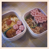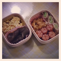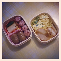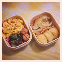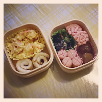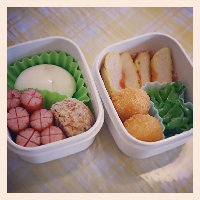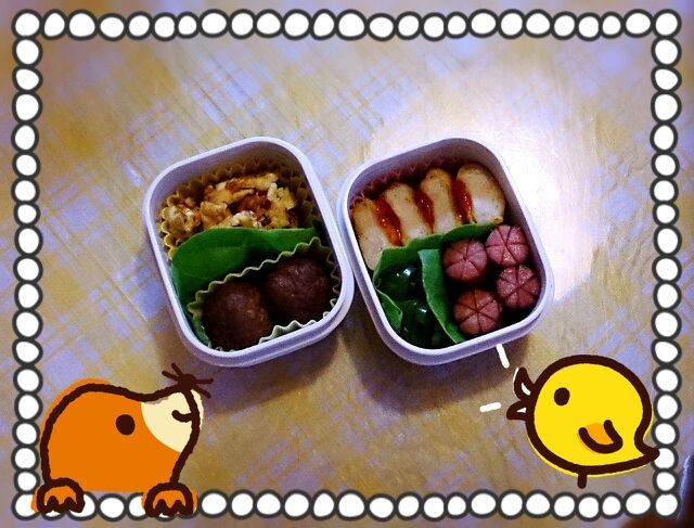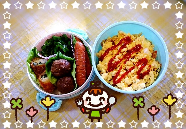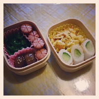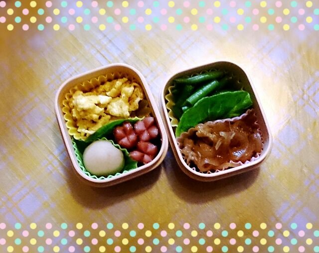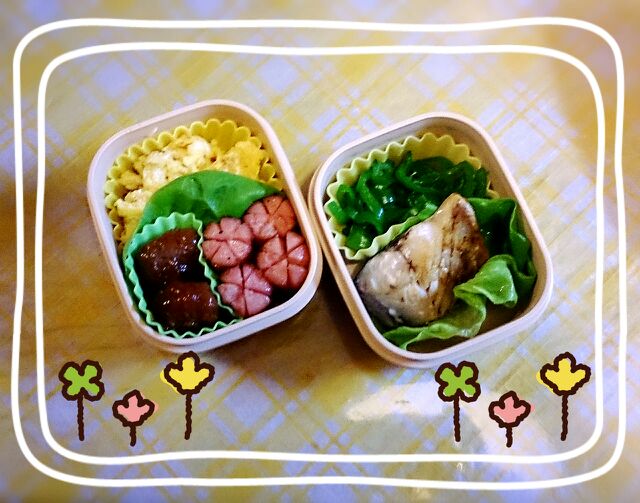 menu ・カニカマ入りスクランブルエッグ ・ちくわとのり佃煮のまきまき ・お花のハム ・ヒジキ煮 ・四つ葉のウインナー ・ミートボール