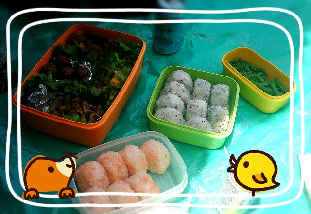 思い出したので5月18日におこなわれた 次男の中学校の体育祭のお弁当 陣取った場所がお昼には半分ひなたになってしまったので見づらいね(笑) おかずのみの写真がこちら menu ・唐揚げ ・ウインナー ・ミートボール ・卵焼き ・煮豚 ・インゲンおひたし ・ゆかりおにぎり ・鮭おにぎり ・グリーンリーフ 今年の唐揚げは醤油味。 子供のリクエストでおかずがきまるので だいたい毎年同じようなメニューかも。 あまり品数多くおかず作っても、 お弁当箱に入りきらない&たくさん残るので 最近はあまり作りすぎない様にしています。