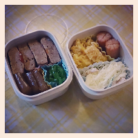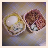 超久しぶりの更新…… menu ・プルコギ丼の具 ・ちくわの磯辺揚げ ・ウインナー ・ポテトサラダ ・5分茹でたまご プルコギ丼の具とポテサラは昨日の夕飯から取り分けておいたもの、 ちくわの磯辺揚げは冷食。