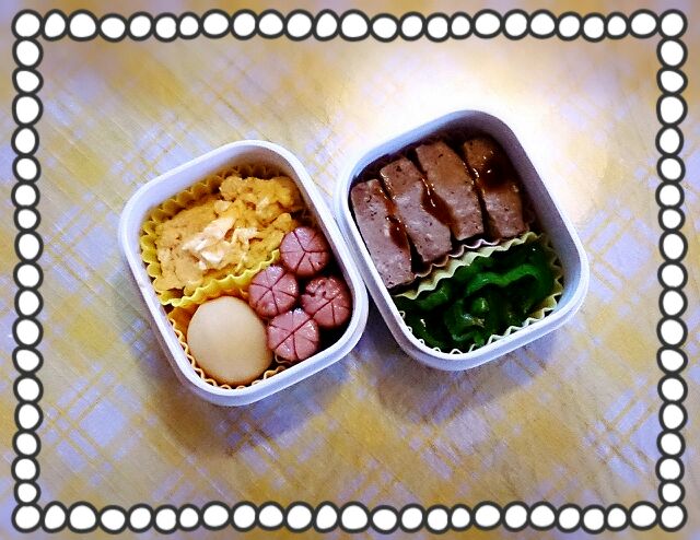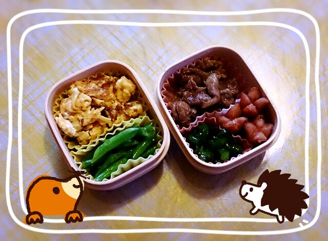 今朝は曇り。 薄日が射したりもしていますが肌寒いです。 制服の衣替えが済んでから梅雨入りし、 それまで暑かったのが嘘のように涼しい日が続いているので次男は風邪を引いた様です menu ・スクランブルエッグ ・インゲンの塩胡椒炒め ・牛肉の時雨煮 ・きんぴらピーマン ・ウインナー