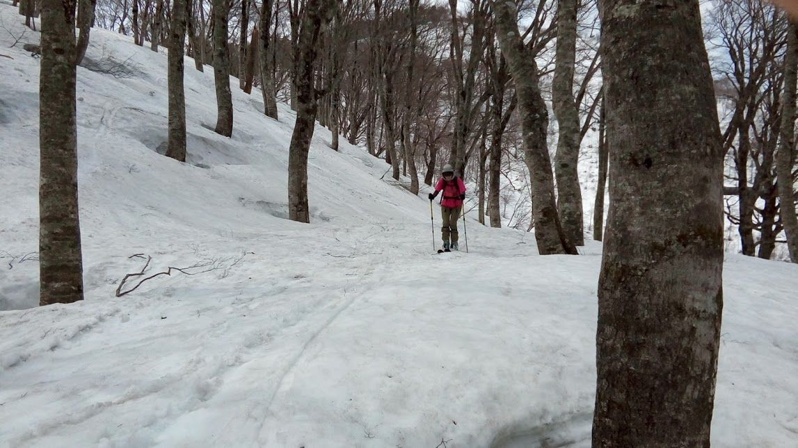 下山は白山白川郷ホワイトロードと合流する所までは快適に滑れたが、徐々に木々が増え、ブナ林の樹木下が大きく抉れてツリーホールができているので、コース取りを慎重に行う。