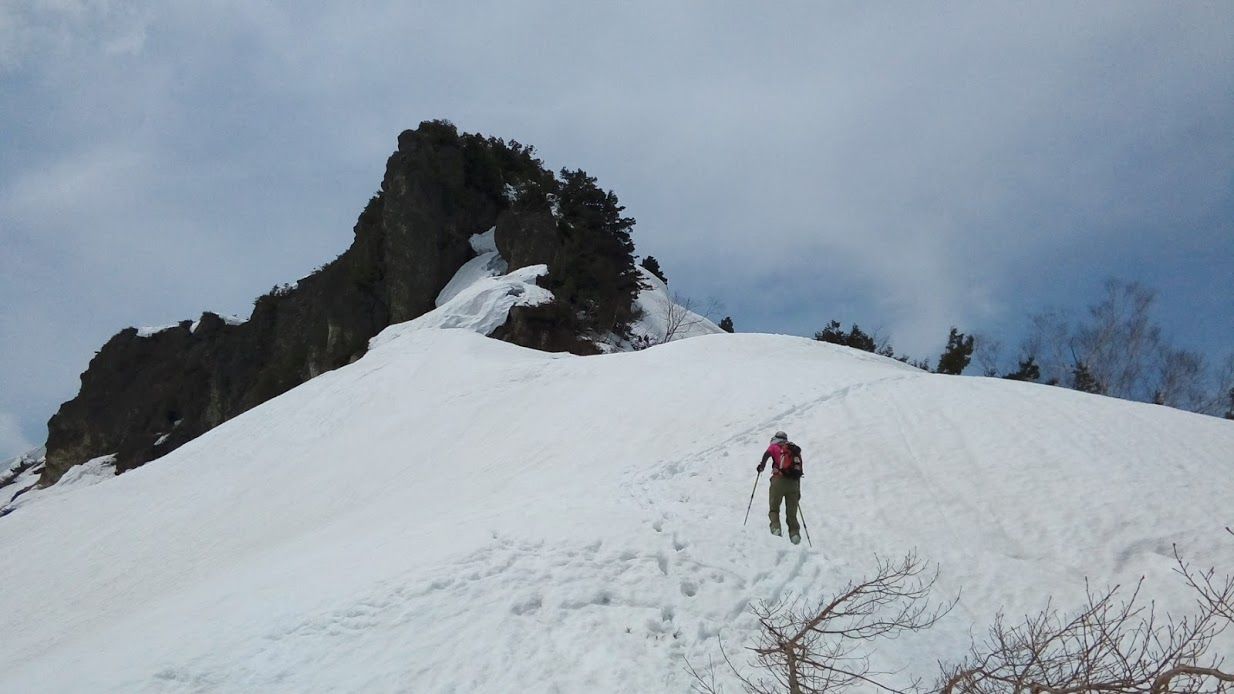 山スキーに慣れていないA.Mさんのことを考えて、M.Kさんの判断で、2人は1586.3m地点にて行動を終了することにした。こちらは天気が良く、時間に余裕もあったので、三方岩岳を目指すことにする。私たちも昨年は1586mのピークで断念しているので気負いと嬉しさが沸いてくる。一旦下ってから、正面に見る三方岩岳の岩の姿は素晴らしい。懐かしい野谷荘司山へ続く稜線もよく見える。
