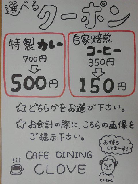 CAFE DINING CLOVEから選べるクーポンのお知らせですまずは画像を見てね(*´∇`*)この画像をお会計の際に提示してもらえれば、下記のいずれかをサービスさせていただきます♪☆25種類のスパイスで作る特製カレー700円→500円☆当店にてブラジル産コーヒー生豆を焙煎する自家焙煎コーヒー350円→150円※有効回数は1回※有効期限は10月31日まで※人数制限はありませんご来店の際にご利用くださいヽ(´▽`)/