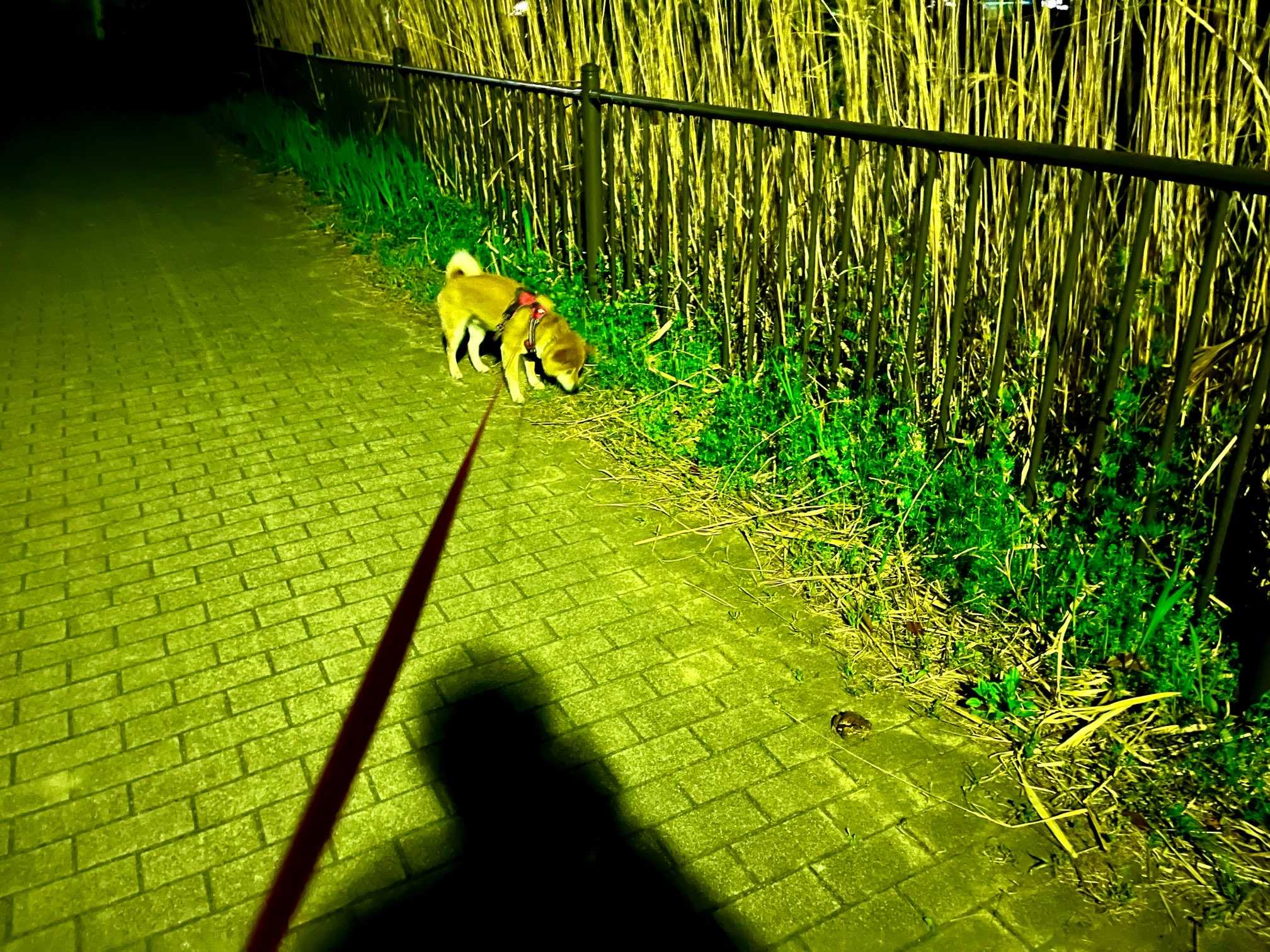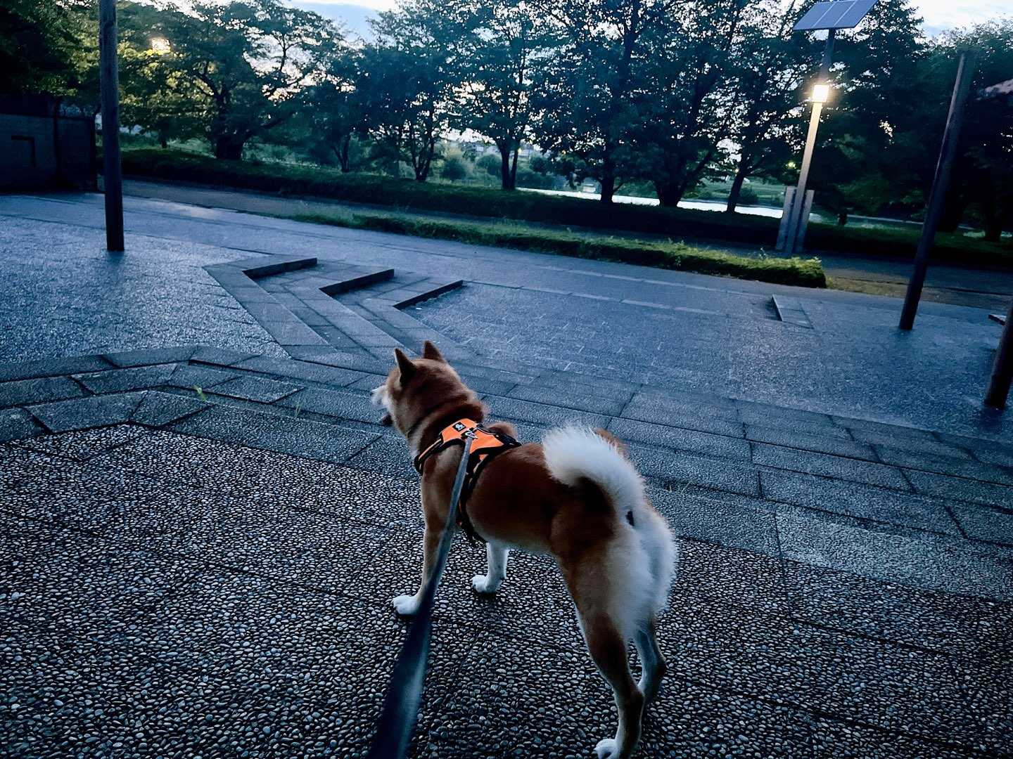 こんばんは。柴犬さくらです。 出羽公園のとある散歩道ですぅ。今夜は、雨が降ってきました。