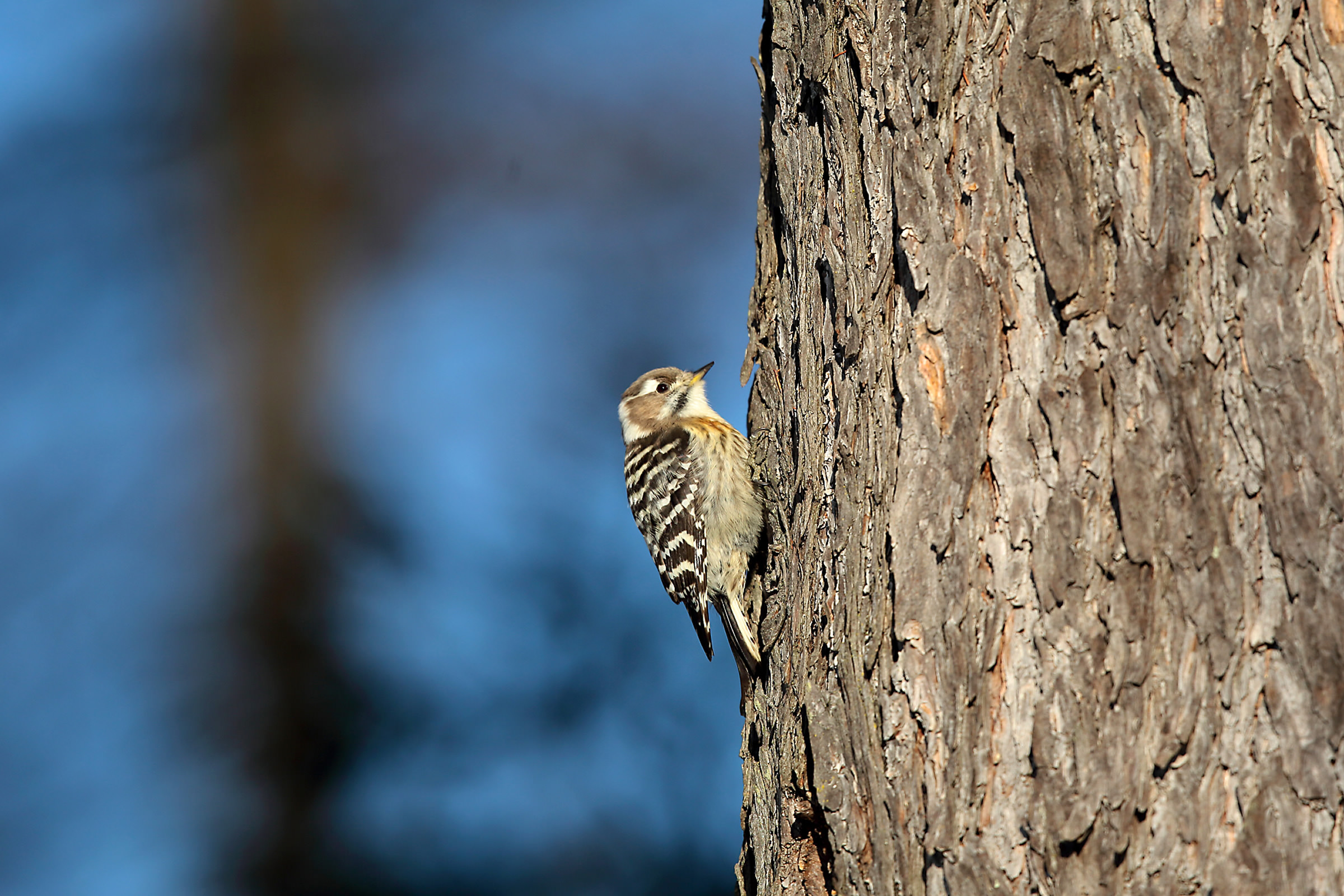 そうしたところ、桜の木からコツコッと何度も音を立てています。スズメより少し大きい程度ですが、コゲラです。木肌を移動しながら、嘴を器用に打ちつけていますよ。木肌に付いている虫を食べているようですね。可愛い顔をしていました。