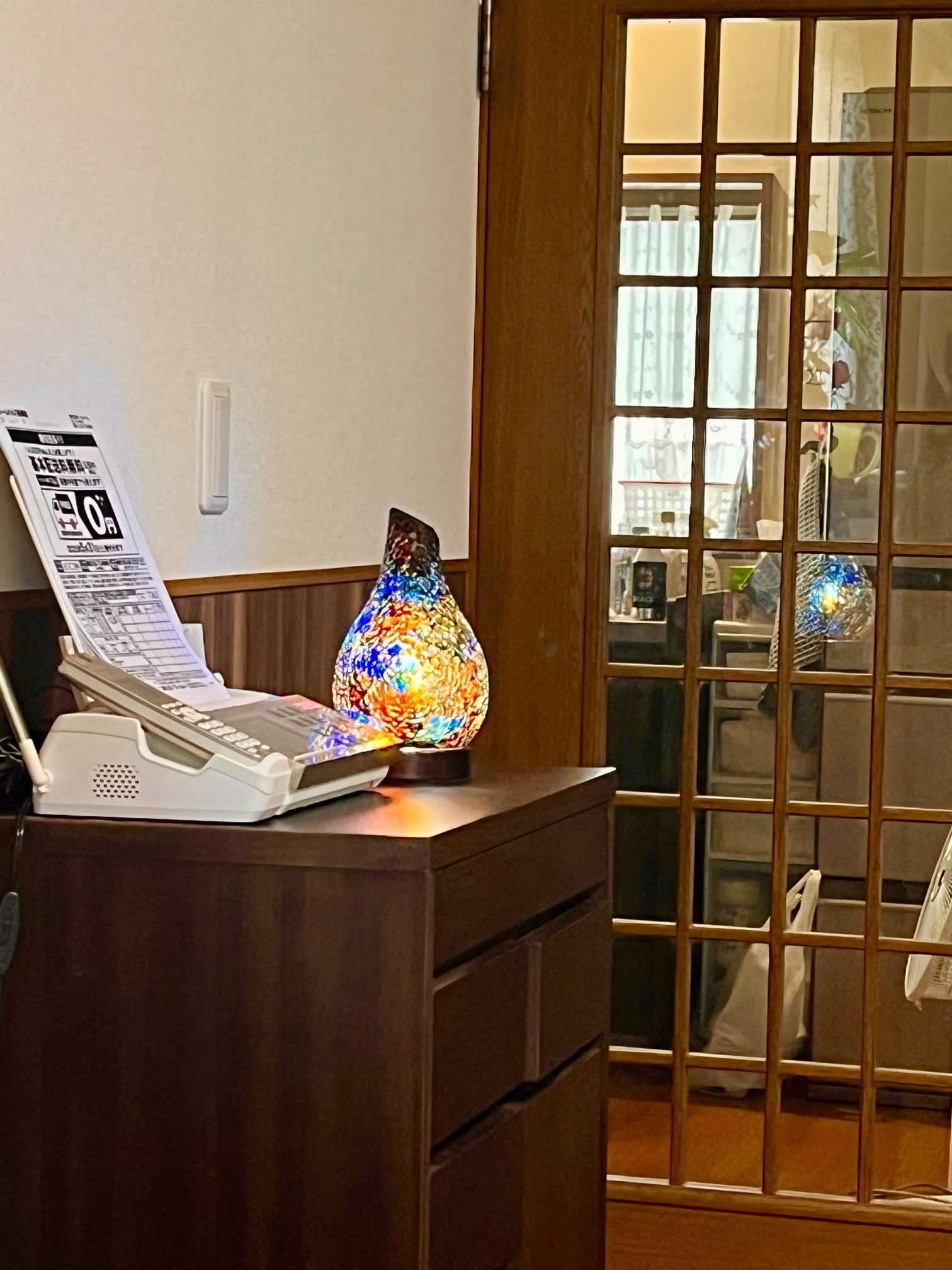 この間、福島猪苗代湖で購入したステンドガラスの照明は、結局、電話機の隣りになりました。複雑な模様ですので見る方向で色彩が変わります。電球は、LEDのものです。これと別ですが小さなサイズの照明では、上部にアロマが置けるようになって電球の熱で香り出す物もありましたよ。今日も穏やかな一日になりますように。♪