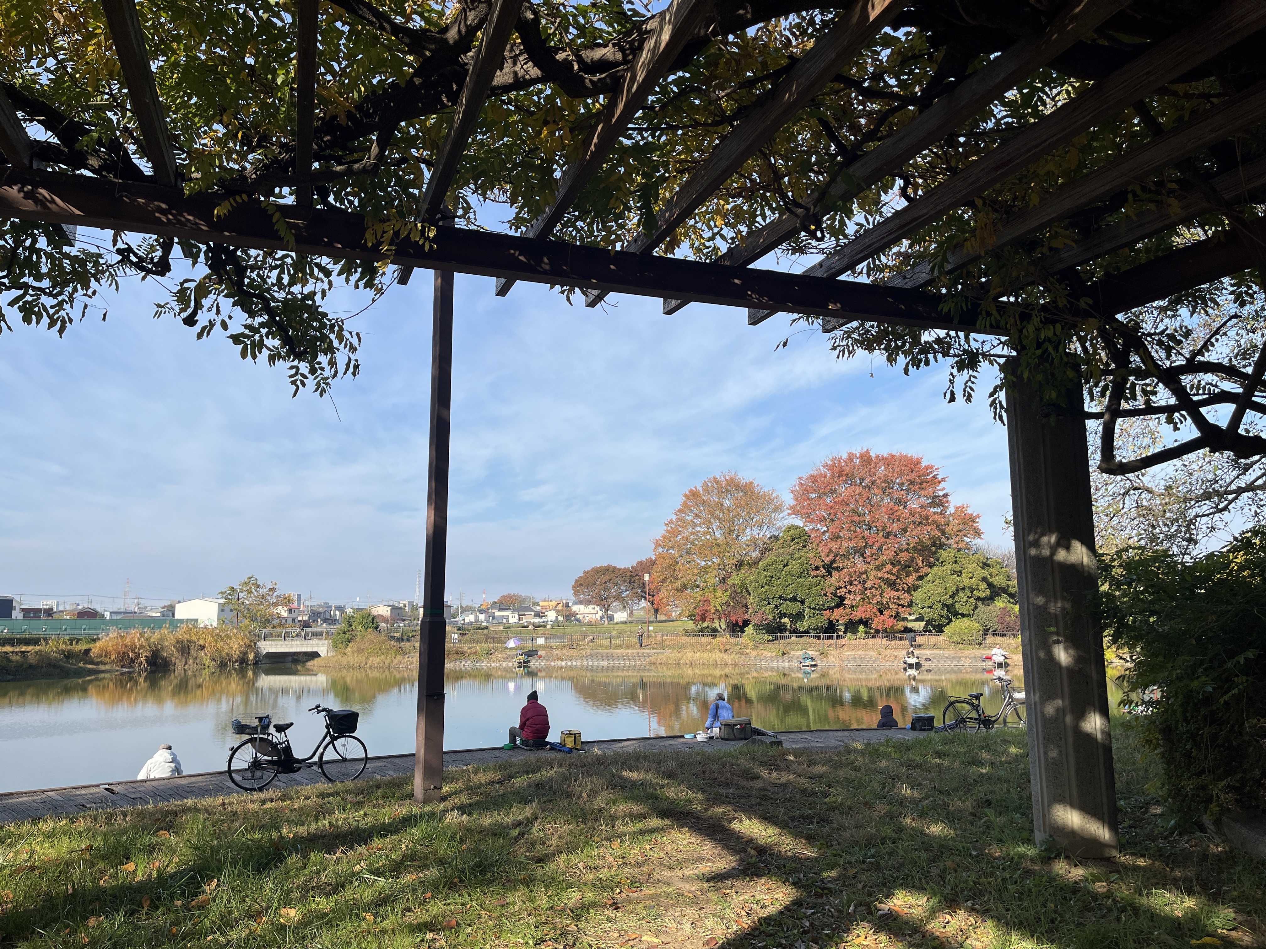 出羽公園の池には、釣り糸を垂らす釣り師が沢山います。