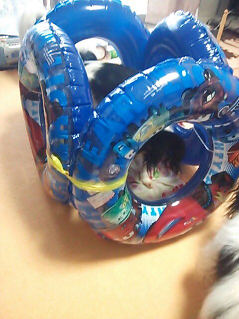 夏と梅雨の時期は、散歩に行けない日が多くなるので、毎年家の中で遊べるアジリティもどきを作っているのですが、今年はこれ! 浮き輪の壁! 出入りして遊ぶもよし、中に設置したクッションで寛ぐもよし♪(*^^*) 好奇心旺盛なアマランス&ヴィスポは直ぐに入ってましたが、慎重な(ビビりな?)ジョイナス&チェルはオモチャやおやつでやっと覗ける程度です(笑)(≧∇≦) そんな中で、自分のお城が出来たとばかりに陣取って寛ぐアマランスを激写!ご機嫌な顔をしてます ( ´∀`)
