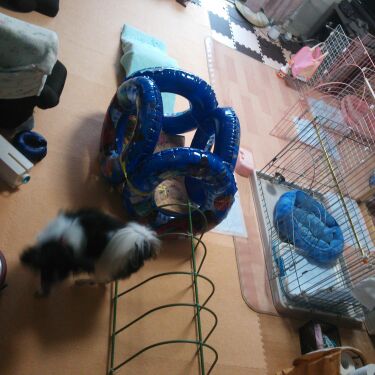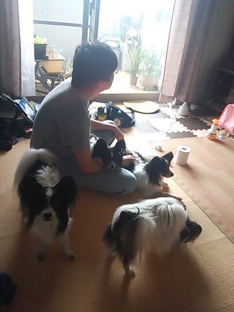 雨が続き散歩が出来ない時に、 手作りアジリティを並べて、 ドッグパーク『パピヨン』 開園です((o(^∇^)o)) 子供たちを一ヶ所に集めて待たせ、 アジリティにフードを適当にばら蒔いて! 《おやつは何処だ?ゲーム》 スタート! 探し方にも個性があって、 見つからないとすぐに違う場所に行く子、 いつまでもそこを探している子、 皆が行かない場所に先回りする子、 誰かが探した後をくっついて探している子… 食べ尽くした後は自由行動! 自分の部屋に戻って休んだり、部屋を散策したり、私に甘えたり。 チェルはアジリティを気に入ったようで こーんな笑顔(*^^*) 遊びに夢中になって、アジリティを怖がっていたことなどすっかり忘れてしまったジョイナスも、最高の笑顔を見せてくれました(*^-^*)ゞ ひとしきり遊んだら、サークルに戻って休憩♪ ドッグパーク『パピヨン』 閉園のお時間です!(*^^*) また遊ぼうね♪(^-^)