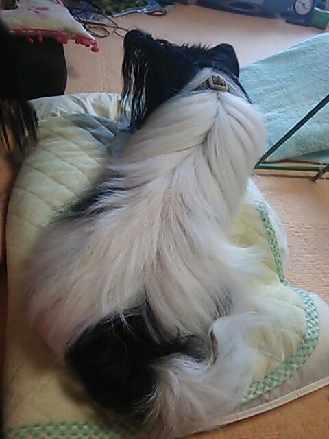遊びも終わって一息付くとき、ワンズは思い思いのポジションを選びます。 ジョイナスは枕を使って作った専用のクッションがお気に入り♪ チェルビアットは相方の座椅子に陣取ります! ヴィスポは要領よく私の膝にちょこん♪(*´ー`*) アマランスは控え目に少し離れたクッションヘ! でも少しずつこちらに近付いて来ます! そして遂にお膝奪取!(笑) もうすぐ9歳とは思えない幼い顔で甘えるアマランスです(v^ー°)