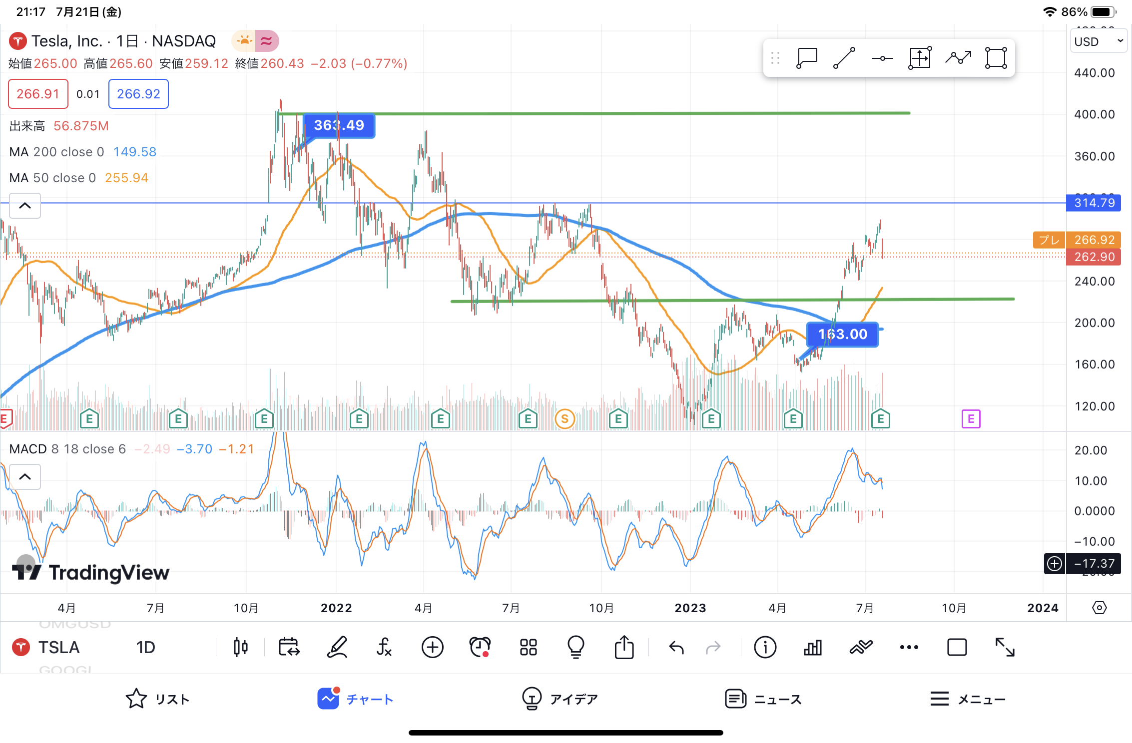 #米国株 #テスラ #爆下げ『こんにちは』もしくは『こんばんわ』、米国株素人のころさんです。 2021年11月テスラの勢いにつられて当時1,100ドルだったかなこのまま2,000ドルにいくとかいかないとか言われていた頃だったようなついさらに倍になるかと参入したところ半額くらいに爆下げこれは素人がイナゴタワーみたいなんに手を出してはいけないかなと勉強になりましたその後3分割されて120ドルくらいまで落ちた時は300ドル程度を超えることはもう無いかと思っていました。これがまさに塩漬けかと・・・これまで米国株は高配当で勝負していたのについつい爆上げ具合に乗ってみたくなったのが運の尽き自分のルールは大事だなと・・・ところが今年に入ってから回復基調でナンピンしようかと思って163ドルで買った分は良かったなとそして250ドルを突破し円安も相まってなんとかプラスに!ありがたやそして、昨日の決算でこけたようで9%の爆下げここからまた盛り返せるかどうか静観しておくつもりですが配当がないのでキャピタルゲイン狙いでどうか上がってくれますように本日もお忙しい中、ご一読いただきありがとうございました。にほんブログ村にほんブログ村