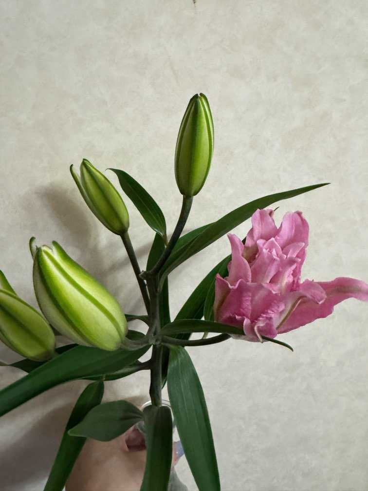八重の百合がきれいに開花。この時点で2つ開花。今は3つ目も咲きました。