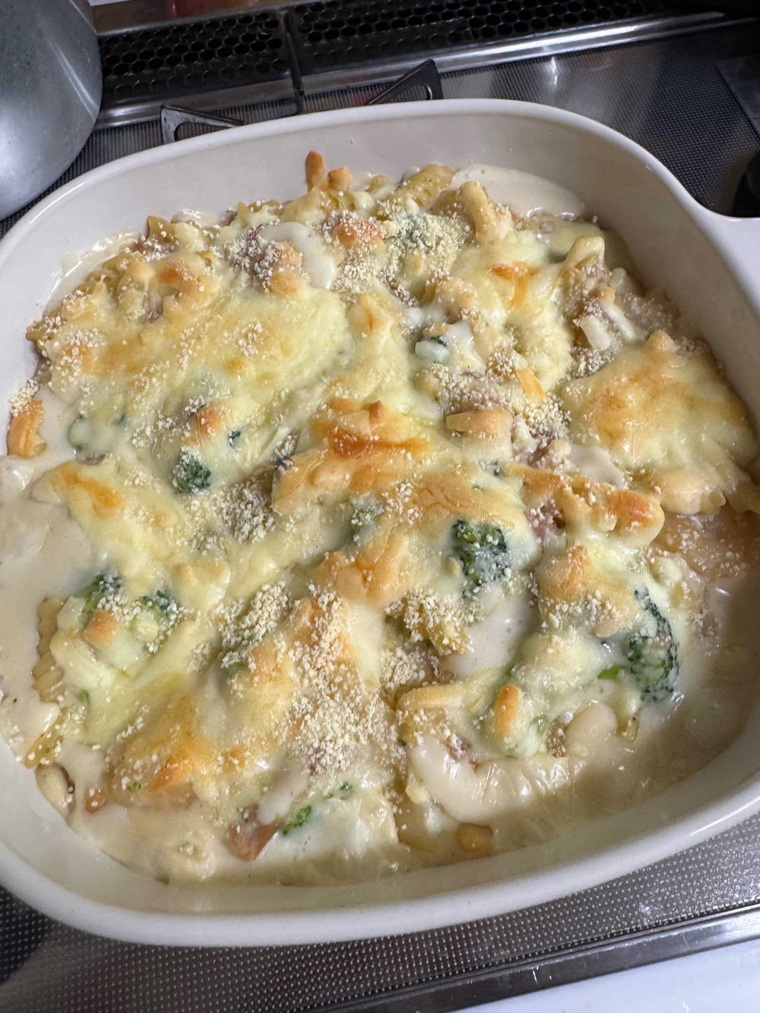 我が家のシーフードグラタンです。冷凍シーフード、フリッジ、ベーコン、玉ねぎ、ブロッコリー🥦が入っています。ポイントは冷たい牛乳と小麦粉を先に混ぜておくこと。あとは炒めた具材の入った鍋に入れて、パスタの茹で時間分火を通せばいいだけです。その後、溶けるチーズと粉チーズをかけてオーブンで焼けば出来上がりです。手が掛からずとても簡単。