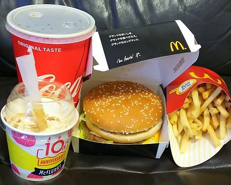 ビックマックの1.3倍の大きさのグランドビックマックを食べました。 セットにプラス100円でMサイズの2倍のグランドコーク、 フライドポテトMサイズの1.7倍のグランドフライになる グランドセットにしました。 すごいボリュームでお腹いっぱいになりました。 マックフルーリー森永ミルクキャラメルも食べました。 美味しかったです。