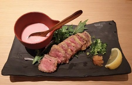 ゲートタワープラザの和食バル音音で食べました。 若姫牛ヒレ肉のレアカツ(ピンクの泡ポン酢ソース)1490円は 思ったより小さかったです。 牡蠣フライごはん(広島県産牡蠣フライ、ごはん、味噌汁、香の物、おばんさい) 1100円は普通の大きさで美味しかったです。 手ごねつくね串(タレ)330円チーズつくね串350円食べました。 尾張千種地ビール600円、国産梅酒480円、沖縄イエラムマンゴー680円 美味しかったです。 好みではなくて残してしまった付け出し400円(2人分800円)が お会計で加算され合計6800円でした。