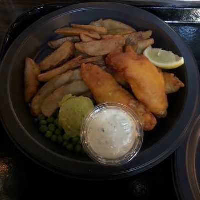 フィッシュ&チップス、糖蜜タルト・ラズベリー&クロテッドクリーム添えを食べました。
