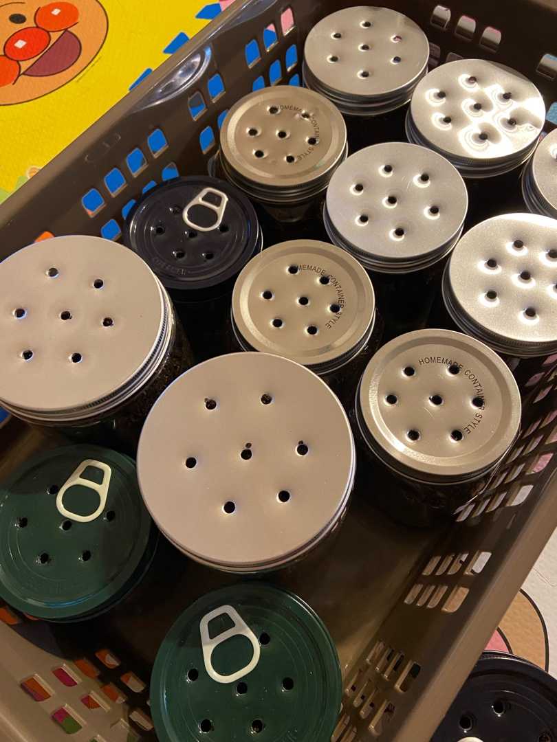 ひとまとめにしてから翌々日幼虫たちがみんなちゃんと成虫に育ちますようにとわたしが選んだ方法は小分け飼育たくさん育て方について説明している人たちの文章を読んでいくと、共通しているようで共通してないのよ。だからわたしのようなど素人は困惑するわけ。そして、生活のごく一部としてカブトムシのお世話があるわけよ。よって、世話がより簡単にカブトムシにとってある程度のいい環境を整えられるようにと考えたらケース飼育よりも確実で小分けのほうが土変えや、幼虫さがしに負担がかからんな。と思ったわけです。100均でよさそうなかわいいケースをさっそく購入💕土を小分けにして幼虫たちを各自のお部屋に入れるのをぱやぴと一緒にしたかったのだがなかなか時間と手間がかかるので翌日は断念しかし、翌々日も難しかった……しかしおかず入れの蓋をそっと開けると1匹幼虫が土の上まで出てきちゃっていて💦こりゃやばい苦しいんだ💦となり焦る幼虫が土の上に出てきてしまうのは酸欠や土の発酵が進みすぎているなどなどとにかく幼虫にとって環境がよくないんだとか。なのでその夜中そそくさと個別にわけるのでした。深夜に妖怪のごとく土をいじるわたしこどもを寝かしつけ、深夜2時に覚醒そこから4時に渡り個室に振り分けた。ジャーン💕その達成感といったらもう……🥺翌日残り3匹を大きめのお部屋に入れるのをぱやぴとしようと、残り3匹だけはおかずケースへ残留100均ケースにドリルで穴を開けたのは言うまでもなく神夫です。わたしがしていたら手に穴が空いていたでしょう🙄幼虫っだいじょぶだいじょぶ