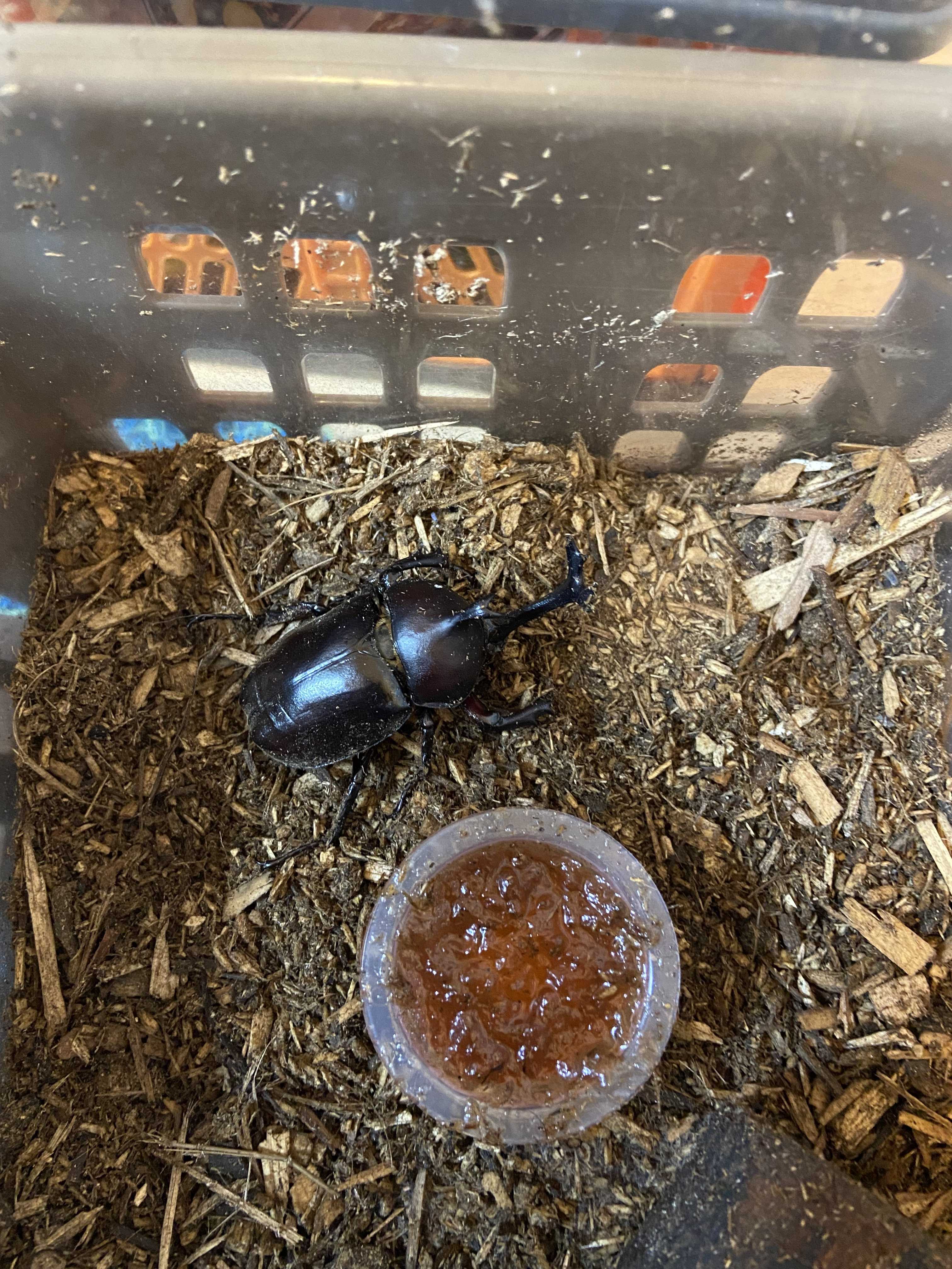 さて、発掘された27匹の幼虫たち。 わたしの生活リズムのせいなのか性格なのか だいたい金曜日に発掘し、日曜の深夜に また土をいじる…… だけど幼虫たちはせまぜましたところでニ晩過ごすので おそらく苦しくなるのか…… 日曜に蓋を開けると1匹だけ土表面まで上がってきている。🙄 なので、ごめーん😓 となって小分けにかりたてられるのです。 なので今回も日曜深夜にせっせと神夫を巻き込んで小分けタイム もうもはやうちは何屋だとおもうくらいの箱の数 今回は3匹ずつイン❣️ やっぱりおっきく育ってほしいから 土を色々考えたんだけど 二種混合してみた🤩 エイト兄みたくでっかく育つんだぞーぃ💪💪💪 今回のタッパは管理しやすいんだけど 前回までより透明度が低くて中がちーと 見えにくい😎のが難点 幼虫ウォッチングに夢中なわたしからすると 非常に残念といいますか…… でも、土繭をつくるころには蛹の観察ができるように何匹か大きく育った子たちは小分けの透明ケースに1匹ずつ入れる予定です。 さてさて一息入れたいのは束の間 今回また温存しとるケースも1ヶ月後どうなることやら。 でも浅めにしてたしだいぶママカブトも消耗していたからそんなには生んでないかなぁ。 今の小屋は最初から別居させているので なんだかパパカブトもママカブトも悠々自適な スローライフ中 ママカブトは夜中にごはんを食べに出てきてるのか 食べた形跡だけ残して 昼間は土の中で過ごしてるみたい。 いいよいいよ。しっかり休んで😆 パパカブトはまだまだ食欲旺盛で ずーっと食べてますがね🙄 なんにしろカブトムシにとってはもう 悲しいかな人生の終盤 快適に過ごしてほしいなぁ✨
