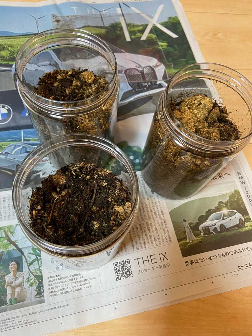 チビカブトが亡くなってからしばらーく放置していたカゴそう。No.2で卵をひとつだけみつけたカゴね。まぁただ片付ける時間がなかったというかひとつだけたまごを産むって虫の世界で不可解じゃん?と思って他にもいるはずであると踏んでいた私でも、卵を潰さずに探すのって労力いるわけよ。だから放置していた。なんの計算でもなくただただ放置そして、カブトムシたちがそこに住んでからまた別邸に移してチビカブトだけの住処になりチビカブトが息絶えてかれこれ1ヶ月が経過しようとしていた8/22ついにわたしはその箱の土を片付けるかと思ったときです。とりあえず土を全部新聞紙に移してから卵さーがそとおもたわけよ。したらばさ……これ……幼虫でねぇのかってのを発見🙄そしてちょうど土を外そうとケースをたてていたもんだから底が見えたわけそしたら数匹幼虫がいるやないですか😅これ……ほんとにカブトムシの幼虫??他の虫沸いた系じゃないやろうね……と少し勝手にゾクっとしたが紛れもなくカブトムシの幼虫やった。サイズは1.5-2cmってとこでわたしの知るカブトムシの幼虫のように手のひらにまるまるのる感じではない……いかにもか弱い……そして………かわいい🥺なんだかうちのチビータと類似してるように思えて……超愛着……ひたすら丁寧に発掘していった。しかし、1匹だけ発掘作業中に傷つけてしまったようで😭殺してしまい……超罪悪感すっごい辛かった。虫たちにこんな感情になったのははじめてかもしれん。その子を含めると20匹の幼虫さんたちが発見されたのでした……とりあえず古くなったおかずケースに収納いやこれ、嫌いな人からしたらただただキモい図なんです。でもね、わたし、飼っているママカブトが一生懸命産んでくれたんかと思ったら愛しくて仕方なかった……No.3にて虫愛に目覚めるのでした。