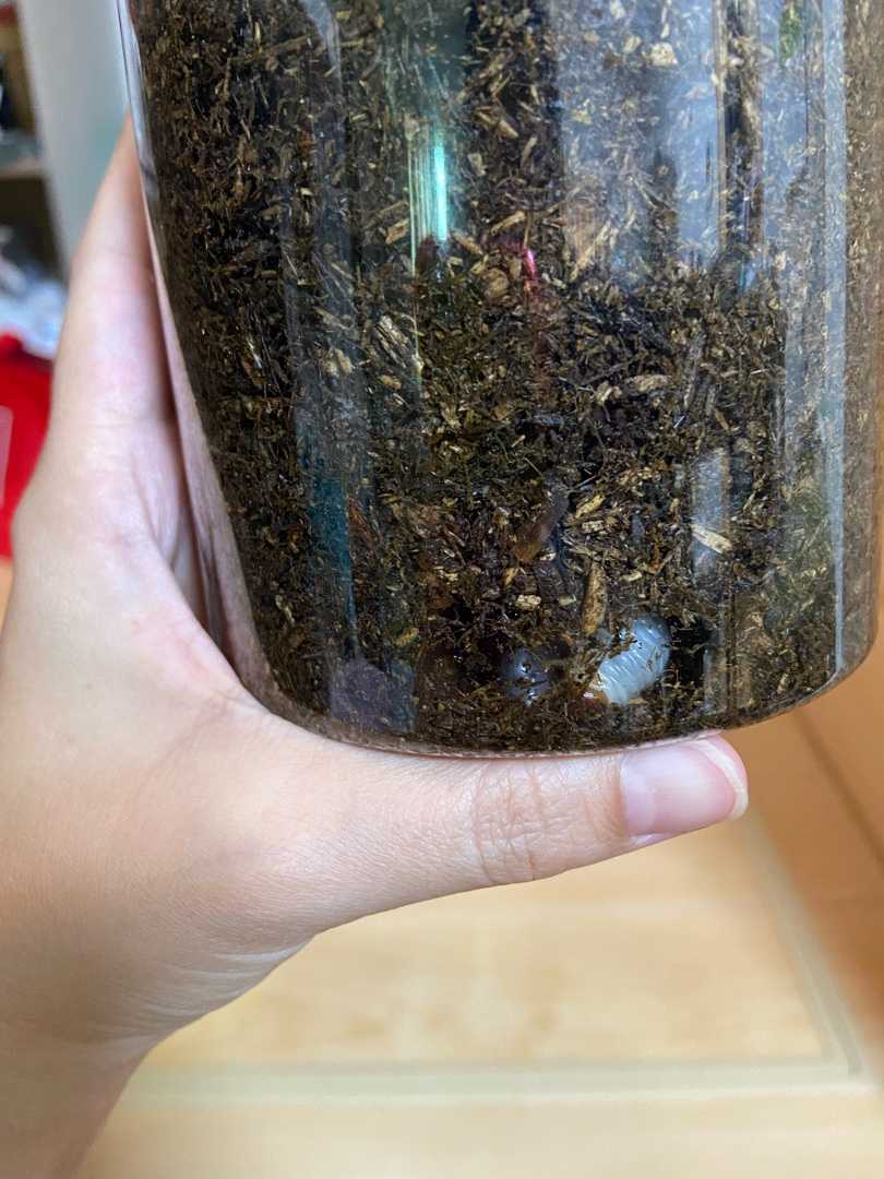 ネットでは1週間に一回土変える とかね まぁ色々書いてあるんですよ。 でもさ、1週間に一回って…… ヘビーである😔 と思ったわたし。 初っ端から2週間に一回変えることを決意 そしてやってきたのだ。ついに土換える日が…… カブトムシのブーンっていう羽の音で 鳥肌のたつわたし。 自分が触ってブーンってなったらひとたまりもないわけです。 しかも、来たときあんなに弱っていたくせに 今や栄養満点の餌に、外敵がいないことにより パワーアップ さらに触れないわたし。 はい、神夫出番です👏 もう一つ土交換用のケースがあると便利だなと思い購入。 そのケースに こんどは失敗しないようにしっかりと湿気を含ませて…… 今回はしっかり下2センチ固めたど!! して、朽木はカブトムシたちが食べてんのか めっちゃ小さくなっていたから なんのために入れるんか不明だったので 今回は朽木は埋めず、 シンプルに飼育マットのみにした。 できあがった新しい寝床に 早速カブトムシたちを放流 まぁもぐるもぐる笑 でも、体の小さなオスカブトは でかいやつにツノでぶっとばされて かわいそうだったので残留したんです。 たぶんツノで攻撃されるから怖くて逃げ惑っていたからブンブン飛び回っていることも大かったチビカブト。 いたたまれなくなって ある夜外に逃がそうとフタを開けてみたんだが するとピタっと飛ばなくなった。 なんだい、森に帰りたかったんでないのか? もうこれで飛んでいかないなら お前さん一生この中で肩身狭く辛い人生なんだぞ? と問うてみましたが やはり飛び立つ気配なし。 こういう子は結局外に飛び立てても カラスに食べられたりするんだろうが…… でも、飛び立たないチビカブトをみていて 不憫に思ったもんです。 チビカブトはそこから1週間弱悠々自適に暮らしていたんだが、 あまりゼリーを食べないなぁ 出てきてないなぁと思っていたら その内、もぐる体力がなくなってきたのか 表面から見える位置にうずくまっていて それでも少しはごはん食べてたけど、 とうとう息絶えた。 最期チビカブトは静穏で幸せな日々を 送れたんだろうかと今も考える。 さて、その1回目に部屋替えしたときに、 なんと卵を発見したのよ。 でも、見つかったの一つだけ。 隔離して様子見てたんだが 孵化せず😿 萎んでしまったらしい。 なかなかうまくいかんもんなんだなぁと 現実を知った。 カブトムシはつがいのみになり まだまだ続く