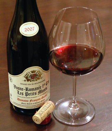 先日のエントリーで書いたフランソワ・ジェルベの感想です。Vosne Romanee 1er Cru Les Petits Monts 2007 Domaine Francois Gerbet (オーレ ジャパン)実はこのワイン、銀座屋さんのセール品で、ヴォーヌ・ロマネの1級畑ながら¥4K台で買えたのですが、まさに掘り出し物でした。次の案内でも同じ値段で帰るなら迷わず追加購入です。香は既に開いていてブラックベリー、カシス、スモークハムに鉄と、黒系果実とミネラル感の有る色っぽい香。ジューシーな黒果実系の味わいは、ブルーベリーのコンポートのような甘味とミネラルが主体で酸は比較的穏やか。2007年の割には過熟感が強いですがカリピノのような甘ったるさは感じないし、柔らかかつクリアで上品な味ですね。タンニンも僅かに感じる程度で、舌触りは滑らかなので今飲んでも十分楽しめます。酸が弱めなのでアフターに伸びやかさやキレは無いですが、上品な甘味と旨味が主体で厚みが有るので素直に美味しいですね。二日目になると香にハーブが加わり、味にも黒から赤系の果実に変わって複雑さも出てきました。酸化のニュアンスも無く味わいも向上しているので、思ったよりも酒質はしっかりしています。あと数年寝かしたら更に良くなりそうなので今から楽しみです。昨年から何度か飲んでいるフランソワ・ジェルベ。凄みは有りませんが、今のところ外れが無く安定して値段以上のパフォーマンスを見せてくれるので、お気に入りの生産者になりつつ有ります。こうなると特級のエシェやクロ・ヴージョも飲んでみたくなりました。
