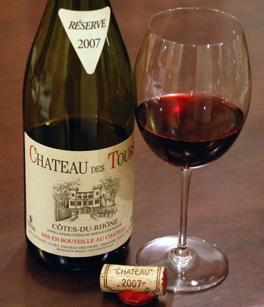 まだまだ過去分が続きます。今回はエマニュエル・レイノーが作るコート・デュ・ローヌで、飲んだのは4月の頭。リリースを待っていた銘柄だったので、我慢が出来ず入荷して直ぐの抜栓です。ちなみにグラスはバカラのオノロジー。久しぶりに使いましたが小振りながらもワインとの相性は良かったようです。Cotes du Rhone Rouge 2007 Chateau des Tours (フィネス)色合いは照りのある濃いめの綺麗なルビー色。閉じ気味なのか香は控えめで、グルナッシュらしい赤果実に赤い花、それと八角に似たスパイス香が少し。まだアルコールとタンニンが強いが、キャンディのように凝縮した果実味で味わいは甘く滑らか。凝縮した果実味とアルコールから来るボリューム感が凄いが、赤寄りの果実味としっかりした酸、アフターのほろ苦さがアクセントとなって今飲んでも十二分に美味い。濃厚ながらエレガントな造りは、ブルゴーニュ好きにも受けそうな味わいでしょう。初日こそアルコールとタンニンが目立ったが、二日目、三日目になって落ち着くと益々果実の甘味と旨味が出て良くなったので、数年寝かせたら更に美味くなりそうです。発売前から期待していたシャトー・デ・トゥールの2007年ですが、リリース直後のこの時期にこの味わいは素晴らしいの一言。¥3,000のワインとしては出色の出来で、この品質の子供のヴィンテージワインがこの値段で買えるのは本当にラッキーですね。幸い保管場所には困らなくなったので、買えるだけ買って毎年楽しむ予定です。それにしても裾物でこのクオリティですから、2007年のシャトー・ラヤスは本当に期待できそう。来年のリリースがとても楽しみです。楽天だと金沢マル源さんに在庫が有るようです。コート・デュ・ローヌ・ルージュ[2007]/Ch.デ・トゥール