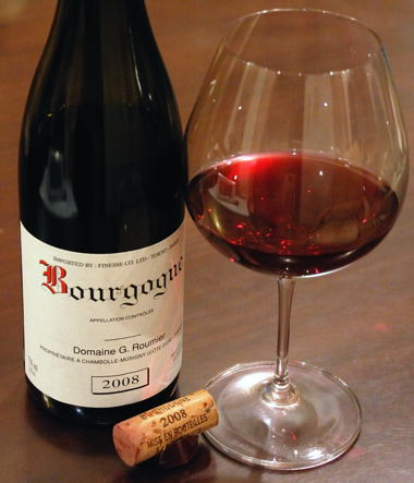 またまた久しぶりの更新です。1月の前半はかなりハイペースで飲んでいたのが、後半に入ってからは、スキーに行ったり、ノロウィルスにかかったりと、アルコールから離れる毎日を送っていましたが、先週末にやっとワインを飲むことができました。と言うことで2週間ぶりに開けたワインはコレ↓Bourogogne Rouge 2008 Domaine George Roumier (フィネス)色合いはやや黒さのあるルビー色で、アセロラ、カラメル、ラズベリーにバラと赤系の華やかな香。味の方は抜栓してしばらくは出汁系に薄く甘味とほろ苦さが乗る、やや強めの酸と果実味が主体でフワッとした軽め味わいでしたが、1時間もするとトーンが低く酸が主体のタイトな構成に変化。と言っても酸化した感じではなく化粧が取れてコアの部分が出てきた感じで、アフターも長くなってます。酸は酸っぱいぐらい強いが、出汁系の旨味や隠れた甘味がバックボーンに有って構成はしっかりしている。最初の印象にはビオっぽさが感じられたが、変化後はどちらかというとクラシックな味わいになっていたのも面白い。二日目になると出汁や甘味が増えたが、結局酸は最後まで変わらず強いままなので、酸が苦手な方には辛いかも。私個人としては酸の許容値が高いので十分楽しめましたが。2008年のレジオナルの割に集中力の有る味わいは流石ルーミエですが、やはり良年の時の村名を越える凄みは無く、良くできたレジオナル止まりなのはヴィンテージのせいでしょうね。もう少し酸が落ち着けば良くなりそうなので、もう1本は1~2年寝かせて見るつもりです。