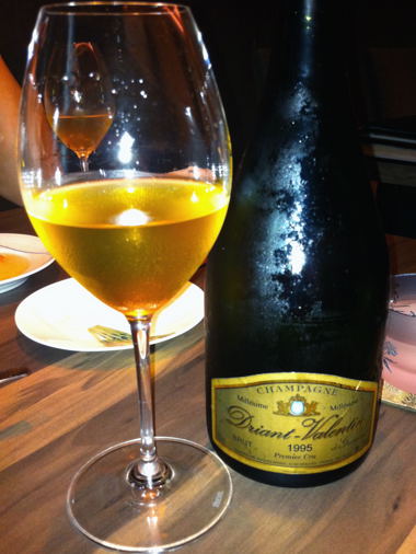 先日友人から某ワインバーのマスターの誕生祝いに凄いワインを開けるので一緒にどうか、とのお誘いが有ったので早速行って参りました。携帯のワンセグで日韓戦を観戦しつつ、まずはお店の泡で乾杯。今が飲み頃でマスターお薦めの銘柄を幾つかピックアップして貰った結果、選んだのがこれ↓。DRIANT-VALENTIN BRUT MILLESIME 1ER CRU 1995実に見事な黄金色。蜂蜜にアップルバター、ブリオッシュなどの熟成した香がバッチリ。甘みと仄かな苦みがアクセントになった味わいは、やや重めで熟成感が出ていますが、ひねた感じが全く無く綺麗に年を重ねた印象。暑い時期に飲むにはややヘビーですが、熟成した泡を手頃に楽しむに良くできたシャンパーニュです。そして早々にメインのご登場。銘柄は当日まで内緒でブラインドで供されたのですが、これがとにかく凄かった!エッジは綺麗なオレンジですが、中心部は透明感が有りながら深いルビー色。グラスから溢れんばかりのバラ、苺、モカ等の華やかで妖艶な様々な香と、苺、ハーブ、干しイチジク、カラメル等々の複雑で若さと熟成感を持ったシルキーかつ凝縮した味わいは完璧なコンディションと熟成度で、銘柄は分からずとも誰が飲んでも偉大なワインで有ることは一目瞭然。そしてそのワインとは・・・Richebourg 1976 Domaine de la Romanee Conti答えを知ってしまえば凄くて当然ですが、飲み頃かつ完璧な状態のDRCに出会えるなんてワイン好きとってこれ以上の幸福は無いでしょう!まさに至福の時を過ごすことができて、友人には感謝の一言です。少し飲み足りなかったので、グラスで↓の銘柄を頼みました。Bourgogne Blanc La Tufera 2008 Domaine Etienne Sauzetリシュブールのフラッシュバックが凄すぎたので印象はかなり薄いですが、2008年の割には酸が綺麗で緩さが無い良くできたレジオナルでした。最近の高騰振りから購入を半ば諦めているDRCですが、こう言うのを飲んでしまうとお金も無いのに欲しくなってしまうのが困りものです。(笑)
