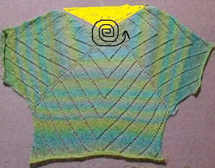 後見頃は前身ごろの襟元の上の逆三角形部分(黄色のところ)も編むので、往復ではなくグルグルらせん状に編んでいきます=クンスト編み