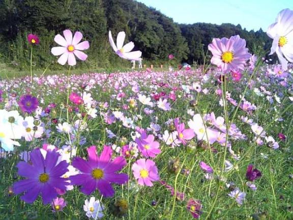 秋の夕暮れ少しひんやりとした空気の中時々静かな風が吹くと細い茎がなびき花が一斉に揺れる突然一緒に歩いていた友達が向こう側で見ようよお日様の方を向いて花が咲いているから綺麗よと言った秋の柔らかい夕陽を浴びて鮮やかな色をしていたどの花も陽差しの方角を向いていた知らなかった。。。。。コスモスもお日様の方角を向いて咲くなんて 秋の日差しが似合うワンちゃんです。小春日和のこんな日は幸せですね 佐倉のコスモス畑です素朴な風景がコスモスにはよく似合いますね