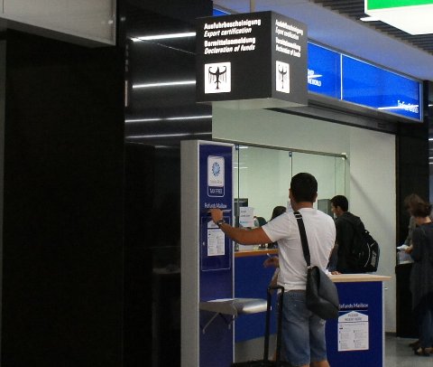 フランクフルト・アム・マイン空港(以下FRA空港)Bターミナルでの免税手続き。(私の場合)これまで大した買い物をしていなかったので空港で免税手続きをする事はありませんでしたがヘルシンキ旅行で買い物をちょっとしたので免税手続きをするようになりました。それも3回目だったので今回もスムーズにいくはずだったのですがこれまで(2010年,2011年)と違っていたので大慌てで結構あせりました。私はFRA空港でユーロ圏を出国なのでFRA空港で出国した後に免税される現品を持って税関でスタンプをもらわないといけません。それがこれまでと違ってまず税関が見つかりません。これまでは出国審査後すぐに税関オフィスが見つかったのですが・・・(もしかしたらいつもと違う出国審査場だったか????)どうやら税関オフィスの場所(部屋)がかわったようでB41ゲートの近くにありました。インフォーメーションで聞いてやっと見つけました。写真で言うと黒いワシの税関マークのここを左に入って行ったところでした。やっと税関でレシートにスタンプをもらえます。基本は現品チェックですがこの時は「いい,いい。」と言った感じでチェックはされませんでした。ちなみに買ったばかりのRIMOWAは機内持ち込みサイズだったのでそれにヘルシンキで買った物を入れて持って行きました。無事に税関でスタンプをもらいこれでOKだと安心していたらそうではありませんでした。つづく。参考(LH航空HPより)FRA空港手続き場所ルフトハンザの日本行きフライトが主に発着するAエリア・Bエリア内の手続きの場所は次の通りです。『税関窓口』は「Export Certification(ワシのマーク)」、『税金払い戻しカウンター』は「Cash Refund」または「Tax Free」の表示を目印に探してください。ターミナル1 Aエリア レベル3(出発階)『税関窓口』: 出国審査後、左側角にあります。『税金払い戻しカウンター』: 出国審査後、上記『税関窓口』のななめ前にあります。 ターミナル1 Bエリア レベル2(出発階)出国審査後『税関窓口』: 出国審査後、出国審査場の並びにあります。『税金払い戻しカウンター』: 出国審査後、上記『税関窓口』のななめ前、エスカレーターのわきにあります。 ターミナル1 Bエリア レベル3(出発階)『税関窓口』: 出国審査後のホール中央にあるエスカレーターで1つ上の階に上がり、左後方にある入国審査場のさらに左どなりにあります。レベル2が閉まっている場合はこちらで手続きします。ターミナル1 Bエリア レベル2(出発階)出国審査前『税関窓口』: 出国審査前、Bエリア内のカウンター(634/644)にあります。こちらは品物を手荷物としてチェックインしたい場合の手続き場所です。『税金払い戻しカウンター』: 上記『税関窓口』の隣にあります。 ターミナル1 Bエリア レベル1(到着階)『税関窓口』: 手荷物受け渡し場内にあります(「出口」側から入れます)。こちらは品物を手荷物としてチェックインしたい場合の手続き場所です。