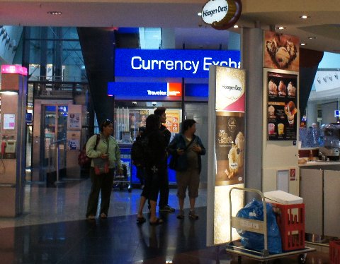 両替の文字のある窓口(写真ではハーゲンダッツアイスクリームの向こう側の青い看板の下)にやってきましたが最初の窓口では「ここではない,あっち。」と言われ次の窓口では「ここではできない。」と・・・ええええ~と落胆する私。すると「ここ(レシート)にクレジットカード番号を書いて 後ろの箱に入れろ。」とのこと。(と聞きとれた。)あらかじめ自分の名前などは書き込んでいましたが現金で受け取るつもりでクレジットカード番号は書かないでいたのでした。とにかくここでも免税手続きはできず次はその「箱」とやらを探します。つづく