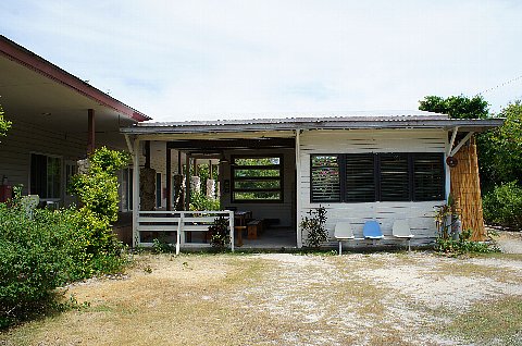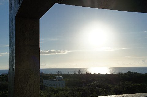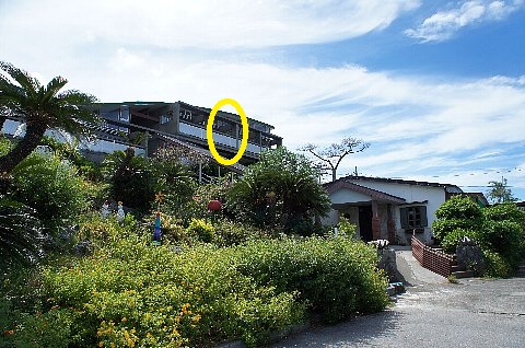 朝食後,ちょっと散歩に出かけます。振り返ってヨロン島ビレッジ。丸印のところが私が泊まった部屋部分。見晴らしのいい部屋でした。本日も晴天なり。日差しが強い。