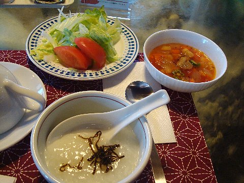 与論島2日目の朝。ヨロン島ビレッジの朝食は,8時からです。この日はかなり早くから目が覚めていてのんびりとした朝を過ごしていました。さて,朝食。コーヒーカップだけ置いてある席に着くとまずは,おかゆとサラダとスープが運ばれてきました。その後目玉焼きとトーストが運ばれてきました。