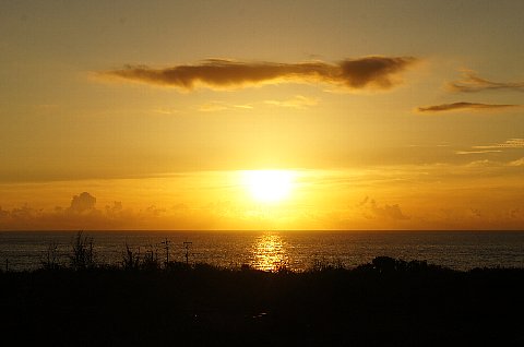 現在19時。空と海が夕陽で輝きます。調べると日の入りは 19:17 のようです。海水面に沈むところを見たかったのですが夕陽は雲の向こうに沈んでいきました。それをのんびり見ていた夕刻のひとときでした。
