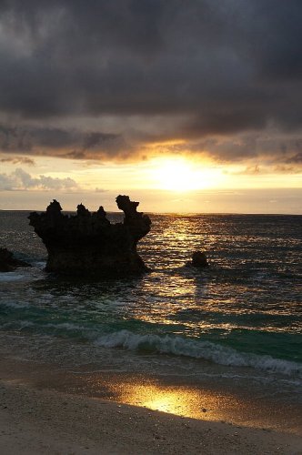 与論島をぐるぐると何周かして(1本道を間違ったらもう1周するはめに・・・)最後にやってきたのは品覇海岸。ホテルにも近いので夕陽をここで見ようと思ってやってきたのです。海は黄金色に輝いていました。