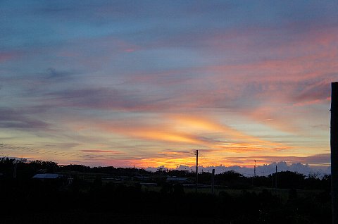 3日目の朝。目が覚めたのは5時半ごろ。部屋から出て東の空を見るともう朝焼けが見られました。この日の日の出予定時刻は 5:48。実は海からの日の出を撮りたかったのですが今から車を飛ばしても間に合わないなあ。でも,とにかく行ってみよう。ホテルのある場所は島の西側。太陽の方を目指して走って最初に見つけた海岸にとにかく行こうと車に乗って飛び出しました。