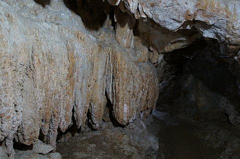 赤崎鍾乳洞の内部。この雰囲気は「ロビンソン・クルーソー」の洞窟探検の世界のよう。(古いアニメでいえば「南の島のフローネ」とか・・・)実際この赤崎鍾乳洞は昭和40年に日本大学の洞くつ探検隊によって発見されたとのこと。進んでいくと地上に続く出口に行きつき引き返しました。小さい鍾乳洞でしたが自然にできた鍾乳洞のいろいろな造形(棚田みないになっていたり,針のようになっていたり)を楽しむことができました。