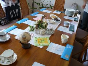 『一軒家deオフ会♪』随分日記アップが遅くなりました・・・なり会のオフ会日記です♪ *********ちょっと変り種、裏話的なオフ会日記です。もう充分みなさんの日記に色々なことが書いてあるのでちょっと私の視点でのオフ会日記を・・・(※人物が載っていますが画像を縮小したので顔はわからないようにしてあります。)待ちに待った6月1日♪前日までの肌寒さや雨が嘘のように晴れて暖かい日(翌日もまた曇りでとうとう入梅してしまいました。この日だけ、こんなにいいお天気~~☆晴れ女健在? いえ、きっと日ごろのきっと参加してくださったみなさんの行いがいいのでしょう(^^)V)とあるお洒落な街の一軒家(レンタルスペース)でなり会の今までのオフ会の幹事さん、お手伝いをしてくださった方を対象にした出張カフェ風オフ会を開きました。この日は私たちだけしか借りている人がいないので貸切状態♪(^^)Vお疲れ様会のような感じにしたかったのでテーマは「癒」今回の幹事は4人。メイン幹事のあやまさん、事務担当のmiwachokoさん、珈琲担当のcafemeisterさん、その他の役目は私。メイン幹事さんをあやまさんにお願いしたのがmiwachokoさんのお家で開かれた出張カフェの時。幹事を引き受けてくださって即、「出張カフェにしよう♪」とあやまさんからの提案が自動的にcafemeisterさんが珈琲担当幹事に・・・miwachokoさんも「私も手伝うよ~」と(*^^*)ありがとう~♪あれ?出張カフェ・・・ということは私も自動的に幹事???完全に引退して次の方たちに手渡そうと思っていたのですが・・・・おかしいなぁ~?????誰もが主役で誰もが脇役のこのなり会♪オフ会の幹事さんはこれからもどんどん次の方へとバトンタッチしていく予定でいます。今回も幹事さん一新♪・・・のはずが・・・でも私は過去のオフ会(大阪、名古屋を含めて)全て出ていて、みなさんとお会いしているので色々な方とコミュニケーションを取るには良かったのかも・・・幹事4人、オフ会の会場のキッチンにて♪さて1日のオフ会、ここまで来るまでに幹事4人が全員集まれた日は1日もありませんでした。みんな仕事をしている曜日が違ったり時間帯が違ったり(時間帯は私か・・・(^^;)夜電話でのお仕事をしていることも多いので・・・)なので下見に行ったりおおまかな打ち合わせをしたり事務的な打ち合わせをしたり・・・をいつも2人か3人で行ってメールであとから報告。miwachokoさんと私は事務手続きなどのことを夜23時過ぎから電話で打ち合わせなんてこともあったよね♪私が出先からあやまさんとcafemeisterさんが男だけの珈琲の会をやってる時に電話で打ち合わせに参加したり・・・なり会男性ふたり(ちなみに小学校の同級生)野点に行く道すがら車の中で打ち合わせもあったよね♪会場下見に行った時はお天気はとってもいいんだけどめちゃめちゃ風が強い日で大変だったりね(笑)また、cafemeisterさんはオフ会のテーマの「癒し」の初ブレンドに挑戦♪酸味のあるブレンドでした。「え?酸味?」って思うでしょう?実はcafemeisterさんの淹れる珈琲はこの酸味が今まで飲んだ酸味のある珈琲とはまるで違う本当に美味しい酸味を味わえるの。このブレンド、試作を重ねて出来上がったものです♪cafemeisterさんの師匠が手に入れている豆なので諸事情により豆の詳しい種類は非公開です。文字が読めなくてごめんね・・・毎回バージョンアップしているメニューはcafemeisterさんの手作りです。今回は珈琲5種類にあわせてBGMも変えるという趣向の凝らし方♪BGMの中の最後のインドのはなんとケースを開けたらガネーシャが(笑)珈琲のイメージにあわせて変えるなんてなかなかないでしょう?(*^^*)←ちなみに普段の出張カフェではなくて今回オフ会だったので特別です♪メニューにないブラジルを淹れてくれたときは私が持っていったボサノバのCDを・・・♪たまたまBGMをかけるという報告を貰ったときに、私もカフェミュージックのボサノバを買っていたのでびっくりのタイミングでした(^^)ボサノバは心地よくて眠くなりますが(^^;)出張カフェでは定番となった地球儀。 これもいつも持参してきてくれます。豆の産地の説明をこの地球儀を使ってしてくれます。(「大将?」 ありがとう~)遠い国から豆が運ばれ日本に・・・そしてオフ会の会場へ豆を挽く機械とポットやドリップするための道具などケースを埼玉のとある所から電車であやまさんと一緒に都内まで持参。普段出張カフェは車に荷物を積んでくるのですが、車だと時間が読めないので今回は電車で・・・・(重いのに遠くからお疲れ様でした♪)エコをちょっぴり意識したオフ会♪関東の方はマイカップ持参☆マイカップたち当日割り箸は使いたくないということでも使いお土産にもなるマイ箸を・・・・(『ケチじゃありません。エコです♪』byとあるドラマ♪観てる人いる?)とあやまさんがみんなの分を購入してくれたり、プランを色々考えてくれたり、cafemeisterさんには珈琲に集中できるように・・と細かい所を気遣う優し