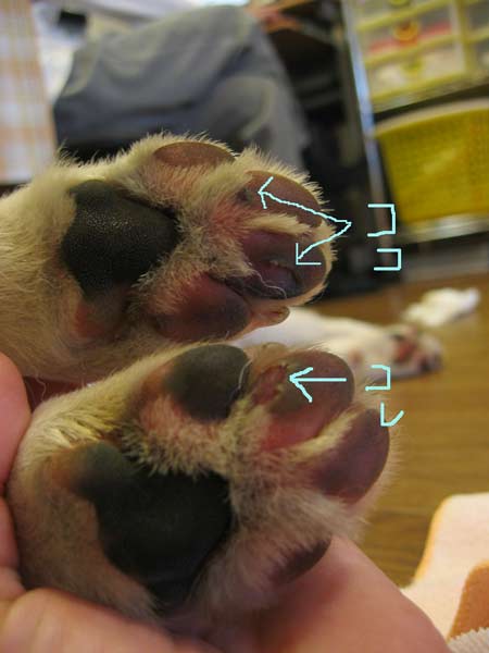 後ろ足を見ると、片方の肉球の黒く厚い皮がベロン…。