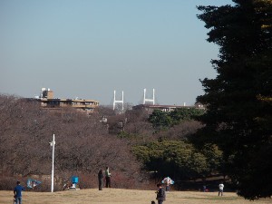昨日の祭日はお天気に誘われて、近くの森林公園に行って来ました。去年の晩秋頃からときどき散歩に行っていたのですが、一人で平日に行くことが多かったから人も少なく、ウォーキングをしている人と愛犬の散歩をしている人ぐらいでしたが、昨日は祭日ということで、大勢の人でいっぱいでした。ゼッケンを付けてマラソンの競技をやっている子供の集まりや、ホリデーランナー(?)の人や凧揚げの子供たち、お決まりの愛犬の散歩の人やらで賑やかでした。私と夫はただ一時間くらい散歩をしてそのまま帰ってしまいましが、カメラを持っていたので、写真をちょっと撮ってみました。(実は暮れに新しいデジカメを買ったのです)冬枯れの木立の写真と、ベイブリッジが見えたので撮ってみました。人も少し写っていて休日の様子が出ていますね。