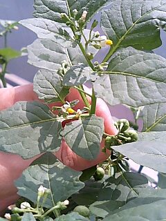 夏にベランダのプランターで主人が買ってきた小さい種類のひまわり(ビックスマイル)を育てました。可愛い花が咲いて夏も終わり、その後枯れて種ができました。また来年植えようね~。と話してたら・・・なんとまた芽が出てきたのです。でもあきらかにひまわりじゃない葉。何の植物だ??一体どこから種がやってきたのか?15階のマンションベランダに風で飛んできた?それとも鳥が運んできた?謎の植物は雑草のようにぐんぐん成長して1ヶ月ほどで50センチ位になりました。小さい白い花が咲き1センチ弱の緑色の実が100個くらいつきました。あまりにも元気に育つので、毎日水をあげていたら初期にできた緑色の実が紫黒くなってきました。(熟したのかな?)愛着がわいてきて、もしかしたらこの実食べれる?なんて期待しつつ一体何の植物か気になったので調べてみました。すると・・「ナス科のイヌホウズキ」ということが判明。しかも・・「アルカロイドを含む有毒」とも書いてあった。ひえ~。主人に話したら速攻捨てられてしまうと思います。ちょっとさみしいなぁ。よ~くみると緑の小さい実が見える?確かにナスの花に形がにてるかも。
