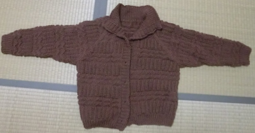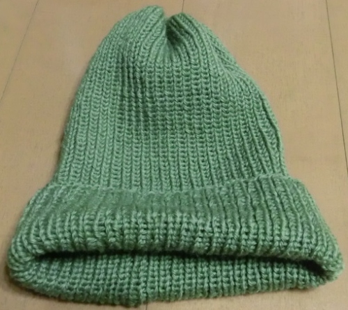昨日はカーディガンを紹介しましたが、カーディガンの他に今季編んだ帽子です。これは主人が耳までかぶれる帽子が欲しいというので適当に編みました。少し長めです。急遽作ったので、模様編みは一切なしの簡単な一目ゴム編で編んでみました。材料は7号4本針。並太45g×2玉。作り方は98目作り目。4本針で1目ゴム編で輪に編んで・・・好みの長さまで編んだら、2目1度で減らし目⇒49目。7目で3目減らすように・・・2目1度を3回+普通に1目を7回⇒28目。2目1度で減らし目⇒14目。2目1度で減らし目⇒7目。残った目に糸を2重くらいに通して絞って、糸始末をしたら完成。
