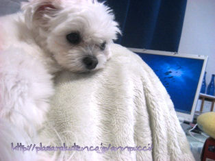 寒くなると毛布に包まってパソコンをします。 すると,その膝の上に乗り,一緒にパソコン画面を 観るプッちゃん。 何か問題でも?