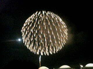 もう1週間以上前のことなんですが、久しぶりに地元の花火大会へ行って来ました。高校のとき以来です・・・(^_^;)ジュンピーが優待席のチケットを持っていたので、 アデージョ2人 で夕涼み。優待席は会場のど真ん中、河川敷へ降りる幅広の階段を仕切った一角です。15年ぶりに見た花火はとっても進化していてドラエモンは噂に聞いておりましたがまばゆいばかりのパステルカラーには度肝を抜かれました。ジュンピーがお家の畑で採れたスイカや枝豆を持ってきてくれてそれがもうとっても デリシャス・ハオツー・ボーノ! なのです 屋台の味がしない生焼けのお好み焼きをつつきながらビール片手にすっかりオヤジモードでした 携帯にて花火を撮影 左側に白く光っているのはお月様 火傷しそうな程近くで輝いていました。ジュンピーが 『 花火の前に練習しとく?? 』 という内容のメールをくれたのですがその 【 練習 】 を彼女が意図するゴルフの練習ではなく酒飲み の練習だと勘違いしたのはご愛嬌・・・