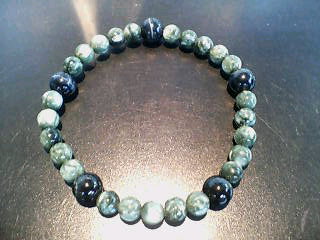 人付き合いが下手っぴな相方にホークアイとセラフィナイトでシンプルブレスを作成。これで少しでも職場の人達から可愛がられますように・・・人間関係が良くなりますように・・・ 白を背景に写真を撮ったら、石が全部真っ黒に写り黒を背景にしたら、セラフィナイトが3倍くらい白っぽく写ってしまいました。実際はセラフィの深いグリーンとホークアイの濃紺が落ち着いた雰囲気で男性的で地味な色合いに仕上がっております。仕事中に着けても差し障りがないように気を配りました。石好きな彼は怪しく光るホークアイと不思議な模様のセラフィナイトをとても気に入ってくれたようで石の効果云々よりも気に入って身に着けてもらえれば何よりです。