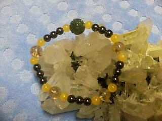 私の手作りブレスをいたく気に入ってくれたお客さんがいて金運アップブレスを作成黒いチビ丸はヘマタイト大きなモスグリーンは翡翠の神獣彫りゴールドルチルの9ミリ玉を黄色翡翠でサンドイッチ。ヘマタイトの怪しい光りと黄色の翡翠で派手なブレスが完成。気に入って頂けると幸いです・・・