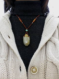 翡翠の香水ボトル。蓋もスクリュー型に彫ってあって、クルクル回して取り外しが出来る細やかさ。さすがに液体は入れられないけれどお気に入りの香水を染み込ませた綿を中に入れるんだそうです。あまり興味はなかったのだけれど今回は蓋に小さなネズミちゃんが彫刻してある品物が2点。 淡いグリーンも捨てがたかったけれど38ミリという使いやすそうな大きさが決め手となり飴色の香水瓶を購入してしまいました。ほんとに小さなネズミちゃん。お任せコーディネートは赤茶の紐にアップルグリーンの丸玉。落ち着いた印象でニットの胸元にしっくりと納まります。翡翠は一見冷たい印象だけれどネックレスとして胸元に着けていると体温が伝わっていい感じに温まっているんです。ふと握り締めたとき、冷たい手をふんわり温めてくれるんですよ。ちょっと視線を落とせばそこに飴色のネズミちゃんがちょこんと丸まっていて私の和ませアイテムとしては最強ですね。ネズミを見つけると見境が無くなる @たぴお なのでした。