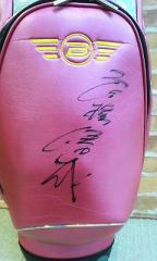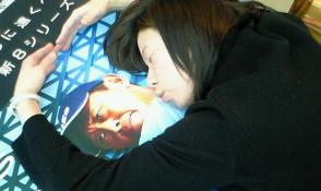 私の独断と偏見によりお店では朝から晩まで高橋勝成プロのレッスンDVDをエンドレス放映しております。お客さんにも勧めまくってバンバン売れております。朝から彼の爽やかな笑顔を眺め、TVの前でクラブを握り彼のトークに胸をときめかせ華麗なスイングにため息・・・今日はお店の模様替えをいたしまして11月から入口正面に飾っていた勝成様の巨大ポスターを剥がすことに・・・剥がしたポスターの上に乗っかり二次元勝成様に抱きついていたらいつの間にかあべっちに激写されておりまして (ほんとは撮ってってせがんだ)メールで写真を送ってきました・・・ (いや送っていただきました)あんまりバカ面なので大公開・・・というか小公開寝ているわけではありません。チューを迫っているだけです・・・