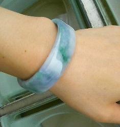 じつのところ、今月はボーナスなんてものがありましてかといって連荘ゴルフで懐に余裕があるわけでもなくまあ来月は私の誕生日があるわけですしされど車の税金にゴルフ場の年会費に払ってないものいっぱいあった~~~などと普通の人間らしい回想を巡らせてみたけれど所詮その日暮らしのギャンブラー絶対的なキリギリス生活者のわたくしたぴお。欲しい物が高すぎて~ (涙)(T_T) なんつってるときに買い回り10倍ポイントされた日にゃ~あ~た、行っとくしかないっしょ~ ジェイドリンク さんのラベンダーグリーンのバングルというわけで先日の携帯買い回り10倍のときに買っちゃいまして~ん♪ ←いつの話じゃ。え~~~、禁煙を記念して・・・いや、コレ欲しくて禁煙始めた説があるほどなんですがなにしろひと月のタバコ代 2万円~ ですから、あらちょうど2ヶ月分じゃ~ん みたいな。自称バングリストのわたくしたぴお、じつはこのバングルが一番高額なものになりました。あら意外と意外ですか?じつはですね、ずっとブログにも書けずにいたエピソードなぜ私が今の今まで1万円以下のバングルばかりを集めていたのかという謎に迫りたいと思います。数年前のこと、翡翠の魅力を知った私はすぐにバングルに憧れいろんなネットショップで探しまくってました。最初はサイズをみる意味でもお安いバングルを2、3本試し買い。そして間もなくジャストなサイズで最高に気に入ったお色のバングルを発見!躊躇せずに購入しましてん♪A貨を看板に掲げているお店でしたし、私はそれをまるで疑ってなかったんです。それが意外な場所で意外な人から 『 そのバングル、本物みたいに染めてありますね。 パッと見じゃわからないくらい。 』と言われてビビくりましたよ~。翡翠の専門家から実に精巧な染色だと褒められちゃったんですわ。そのときは何を信じれば良いのか分からなかったです。ほんとに染色なのか?自分が気に入っていれば染色だろうがいいじゃないかでも染色だって分かってたら大枚叩いて買わなかったよね。。。。そう、知っていたのならあの場所へなんて決して身に着けて行かなかった。知らずに身に着けていた自分がとても恥ずしくなったんです。バングルを購入したお店に裏切られたような気がして(見る目の無い自分が悪いんだけど)ちょっと人間不信というか、もう高額なバングルには手を出すまいと・・・綺麗なバングルは欲しいが高額だ。そしてそのバングルが自分にとってそれだけの価値があるのかほんとに自分が求めている物なのか、信頼のおける品物なのかす~っかり自信喪失してしまいそれ以来万超えのバングルなんて恐くて手を出せなくなってしまったんです。あれから数年、多少は目も肥えたか??? (笑)今思えばあれ以来用心深くなったことだし、安い授業料だったのかな~とにかくこのたびそのトラウマを打ち破ってくれのがジェイドリンクさんのこのバングル。こちらのお店では珍しく【 訳アリ 】 なお品物だったんですがとても正直に細かくその訳が明記されていたのですごく安心したのです。品物の説明文を読んでいて、あ~信じてみようかな~と思えたんですね。届いたお品物には確かに小傷が確認できたけれど明記されてなかったら気づかなかったんじゃないかと思える程度のもの。天然石だもの、完璧だとは思っていないし私にとっては嬉しい誤算。素晴らしい紫やラベンダー、翠の共演。もしも訳アリ扱いでなければ私には高嶺の花、手の届くような品物ではなかったと思います。実物は上の画像よりも透明感があって、全体的に青みがかっていて本当に美しい。フラットタイプはバングルっていうよりなぜか 【 腕輪 】 って感じがして古風なイメージですのよ。 ジェイドリンクさんのラインナップはミックスやマーブル、ラベンダー系も充実していて手元に届くたびに翡翠の新しい魅力を発見してしまう。丸玉いいな~素敵だな~